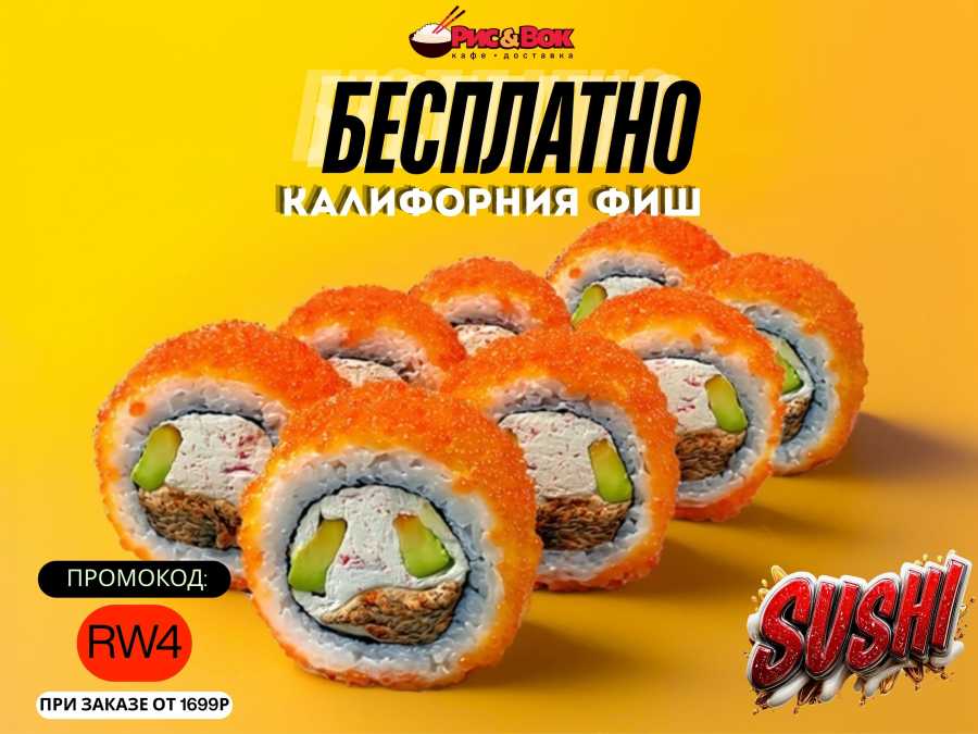 Ролл Калифорния Фиш БЕСПЛАТНО при заказе от 1699р по промокоду: RW4